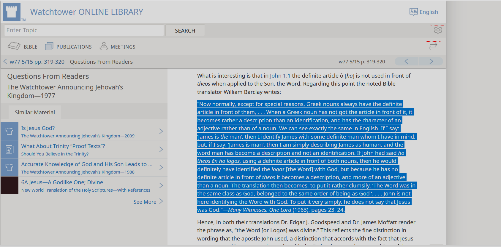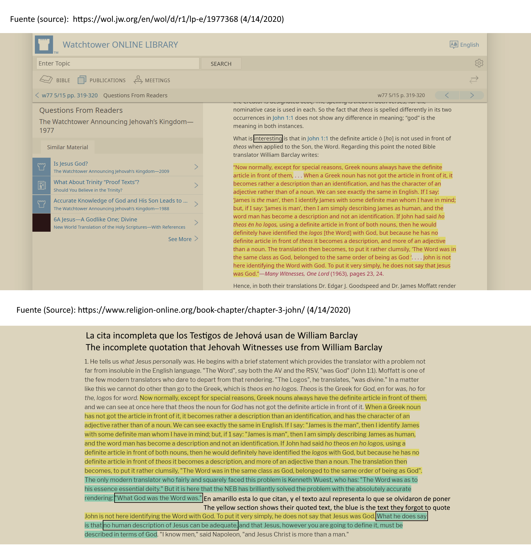 [xvi] Ver https://wol.jw.org/en/wol/d/r1/lp-e/1977368#h=8 (mi propia copia), una versión online de una publicación oficial de la Watchtower (la organización que desde Warwick, New York, U.S., decide todo lo que los Testigos de Jehová en el resto del mundo pueden y no pueden creer), donde al citar William Barclay (libro Many Witnesses, One Lord (1963), páginas 23, 24.) mencionan que este escribió que: “Si Juan hubiera dicho ‘ho theos ēn ho logos’, usando un artículo definido delante de ambos sustantivos, entonces definitivamente habría identificado el logos [la Palabra] con Dios, pero como no tiene un artículo definido delante de theos se convierte en una descripción, y más de un adjetivo que un sustantivo… Él no dice que Jesús era Dios.” (Mi traducción del inglés). Esta explicación, escrita cuidadosamente, también está disponible en español. En la versión original de Barclay, sin embargo, se puede detectar más claramente donde exactamente los Testigos pararon para evitar mostrar la historia completa de lo que este teólogo realmente escribió (en la continuación del texto, que es omitido, y como se muestra en el sitio web Religion-Online.org o, aún más claramente, en el archivo que construí para mostrar estas diferencias gráficamente).